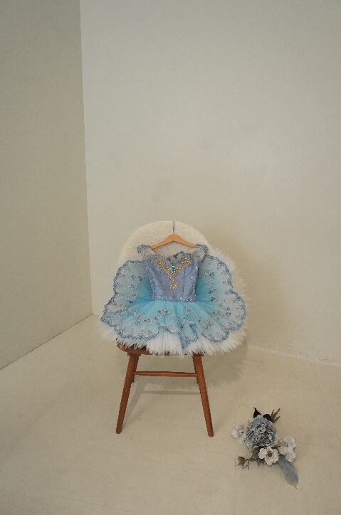 落ち着いたブルーのボディにゴールドのモチーフをあしらった、フロリナらしい華やかなチュチュです